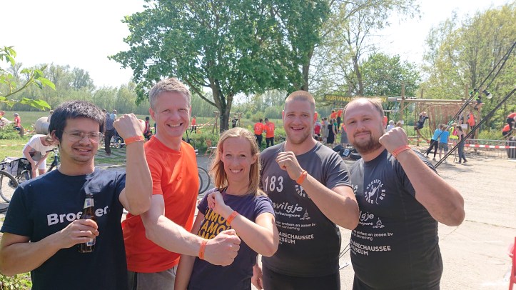 Een groot compliment voor alle vrijwilligers, wat worden we bij elke hindernis leuk ontvangen! Vrolijke, gezellige uitleg en fanatieke aanmoediging :). Ook heel leuk zijn de creatieve hindernissen die ik nog nergens anders gezien heb. Zo moeten we ons bijvoorbeeld met een touw van kano naar kano trekken en overstappen, over ‘drijvende’ pallets rennen en met een molenzak rond de molen hollen. En grappig op 2e paasdag, het gezaagde schijfje moet door ‘konijnenbillen’ en met een rauw ei klimmen we heel voorzichtig door de appelkisten. Eén momentje met hoogtevrees, vanuit het water moeten we best hoog in een touw klimmen om apenhangend onder een brug door te gaan. Ik twijfel even of ik er weer uit zal gaan, maar vind dat dan gelukkig toch niet nodig ;).
