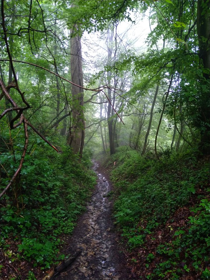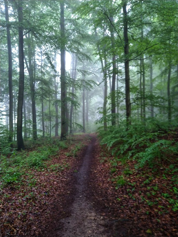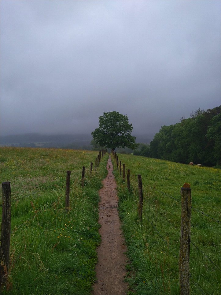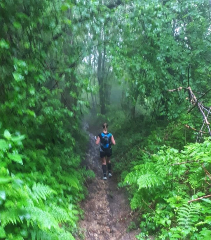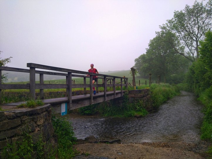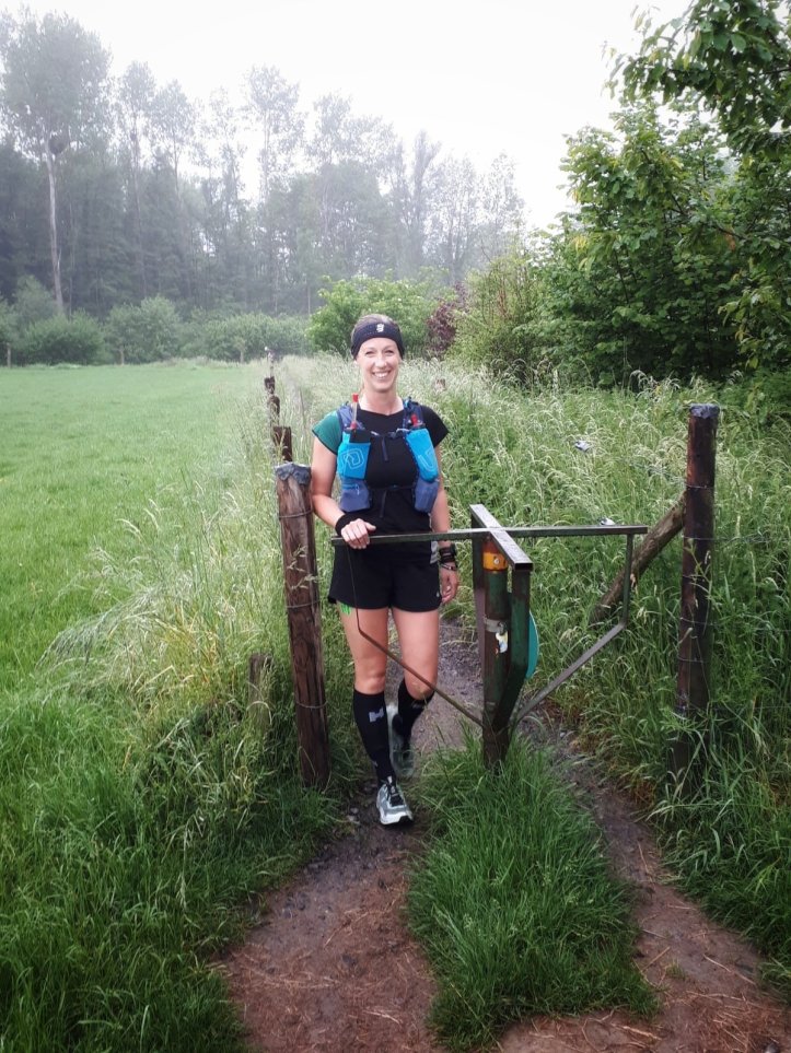 5 juni, 04:30 uur in de auto, op naar Zuid-Limburg. De weersverwachtingen lijken perfect, niet zo heet als de dagen ervoor maar wel droog. Vlak voor start checken we de buienrader nog even en ja hoor, de regenjas kunnen we mooi in de auto laten liggen. We hebben ook al genoeg bagage op onze rug ;). Benieuwd naar de route, de omgeving, de ervaring; zin in dit avontuur vandaag! Na een half uurtje hollen begint het toch te miezeren…en zijn onze voeten ook al zeiknat door al het hoge gras waar de eerste paadjes doorheen lopen. Bij 25km hadden we gepland even te pauzeren, maar in de regen op een bankje zitten is niet echt genieten, dus we stoppen wel even om wat te eten maar lopen daarna ook snel weer door.