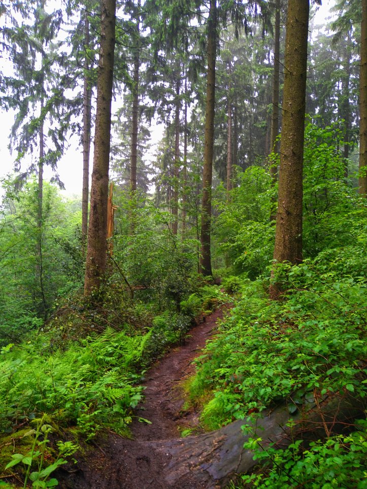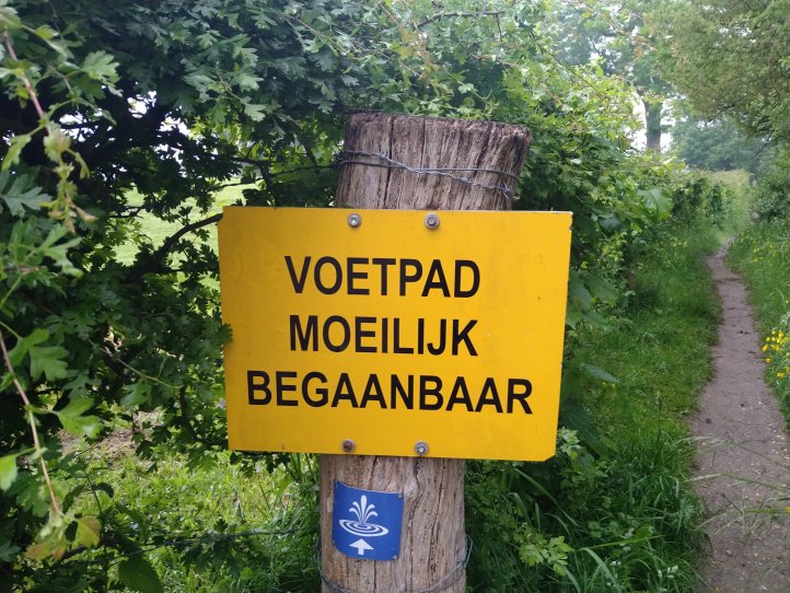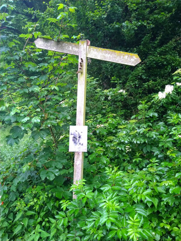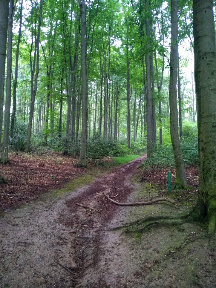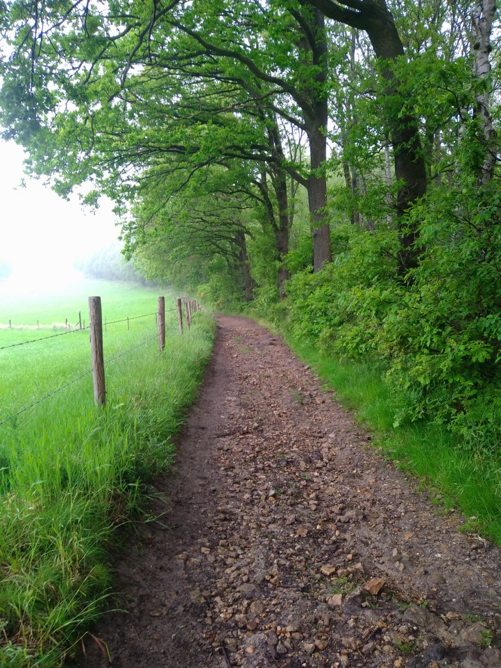 De route is erg mooi, heel afwisselend en vooral de stukken bos waar we doorheen lopen zijn prachtig. Het is jammer dat het blijft regenen en dat alles zo glad is door het natte weer, want je krijgt echt zin om lekker te crossen met al die leuke paadjes. Het tempo ligt niet hoog hierdoor, maar toch vliegt de eerste helft eigenlijk voorbij. Anneke wordt gebeten door een hond(je), gelukkig niet al te veel schade dus we kunnen door. Na ruim 40 kilometer komen we op het drielandenpunt. Hier gaan we even ergens warm en droog binnen zitten voor een kop thee en koffie. Schoenen uit voor droge sokken, Anneke heeft zelfs droge zooltjes mee (goeie tip!). Onze voeten zijn helemaal gerimpeld doordat ze zo nat zijn en ik voel wat blaren opkomen, stukje tape alvast erop ook maar.