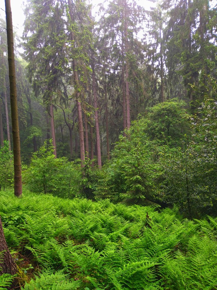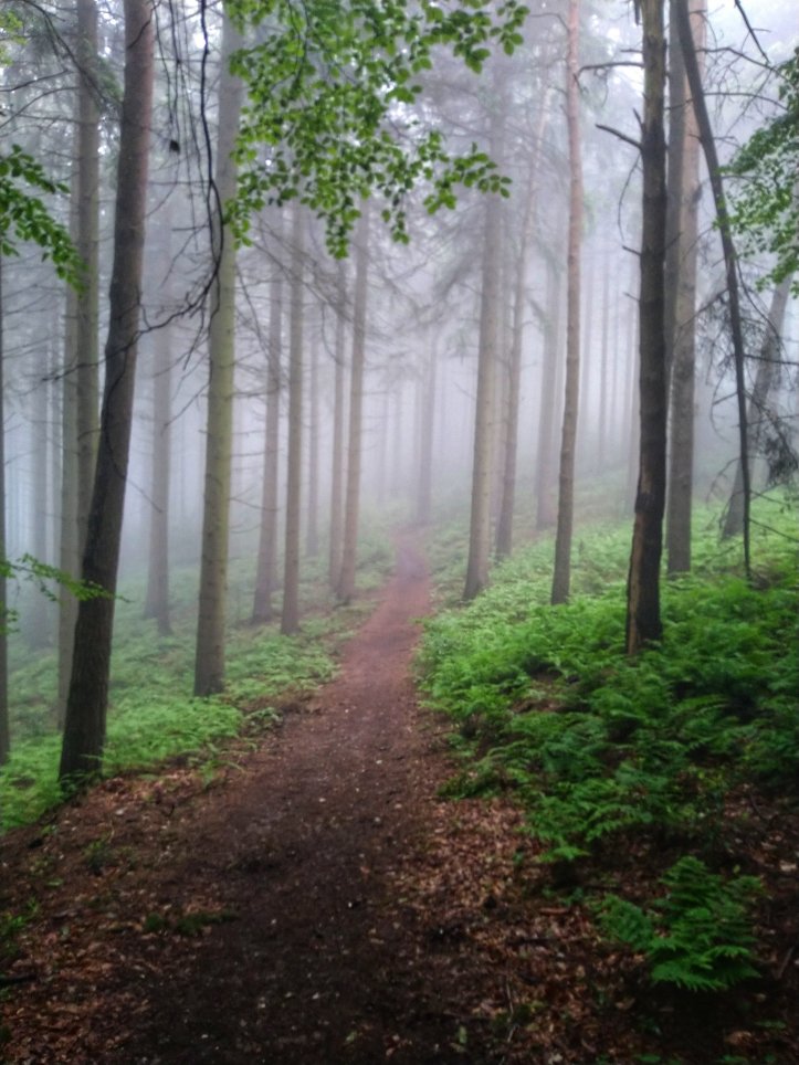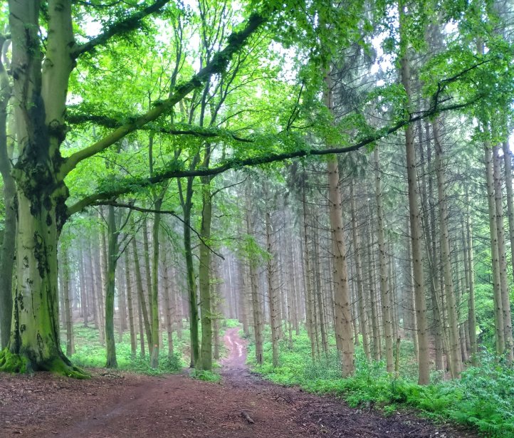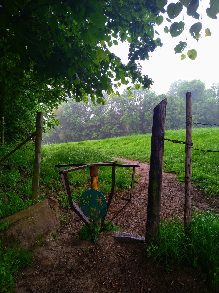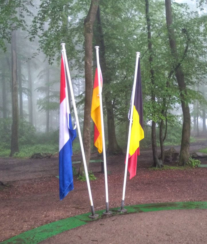 De route is erg mooi, heel afwisselend en vooral de stukken bos waar we doorheen lopen zijn prachtig. Het is jammer dat het blijft regenen en dat alles zo glad is door het natte weer, want je krijgt echt zin om lekker te crossen met al die leuke paadjes. Het tempo ligt niet hoog hierdoor, maar toch vliegt de eerste helft eigenlijk voorbij. Anneke wordt gebeten door een hond(je), gelukkig niet al te veel schade dus we kunnen door. Na ruim 40 kilometer komen we op het drielandenpunt. Hier gaan we even ergens warm en droog binnen zitten voor een kop thee en koffie. Schoenen uit voor droge sokken, Anneke heeft zelfs droge zooltjes mee (goeie tip!). Onze voeten zijn helemaal gerimpeld doordat ze zo nat zijn en ik voel wat blaren opkomen, stukje tape alvast erop ook maar.